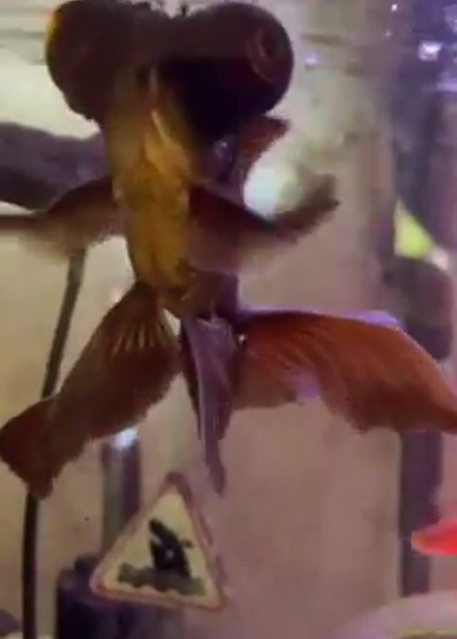 two goldfish in an aquarium. One is a dark brown telescope goldfish with large, protruding eyes and long, flowing fins. The other is a red and white oranda goldfish with a prominent head growth. The aquarium is decorated with artificial plants, rocks, and a hollow log. There is also a small sign with a silhouette of a person falling into water. The fish swim around the tank, interacting with each other and the decorations. The camera remains relatively still, providing a clear view of the aquarium and its inhabitants.