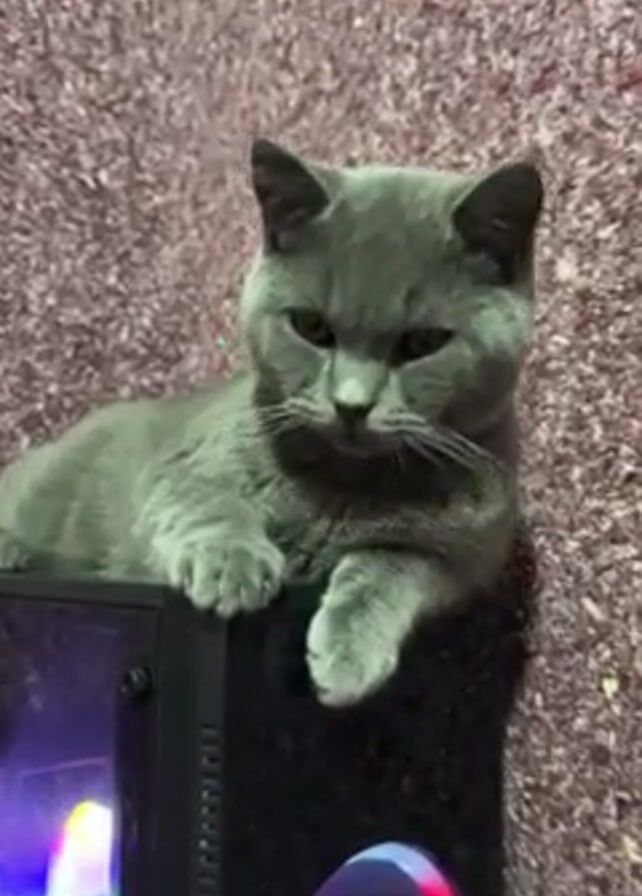 A single stationary close-up shot shows a gray cat lying on top of a black computer tower