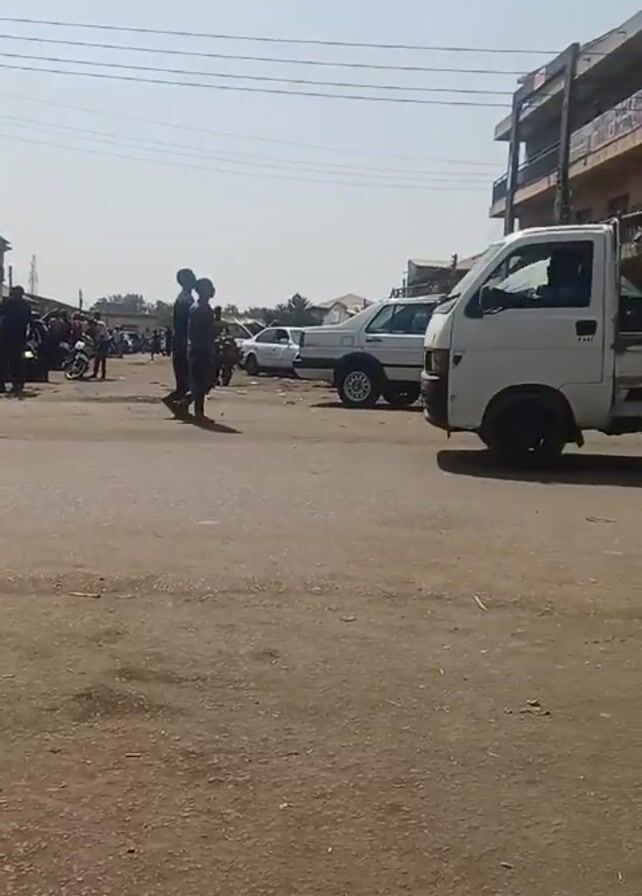 The video depicts a street scene in a densely populated area, possibly a market or commercial district