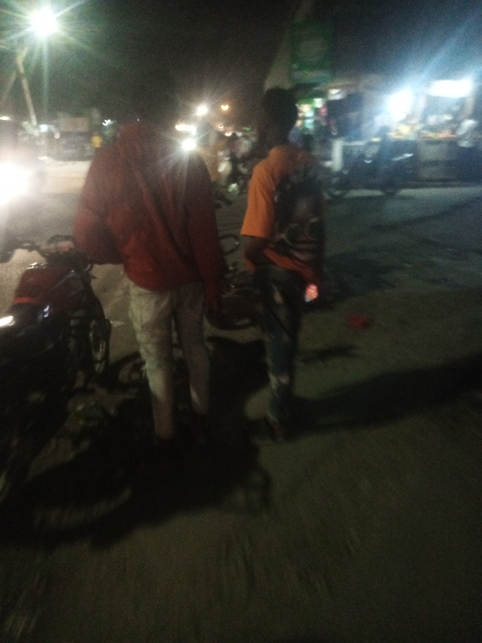 Two people stand at night, with one wearing a red jacket and light-colored pants, the other in an orange shirt and jeans. A motorcycle is visible nearby. The street is lit by bright streetlights, creating long shadows. In the background, there are other parked motorcycles and a brightly lit stall or shop. The scene is grainy and appears to be taken with a low-light camera.