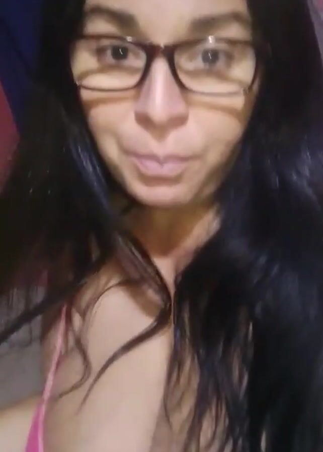 A woman with long dark hair and glasses is speaking to the camera, singing a song