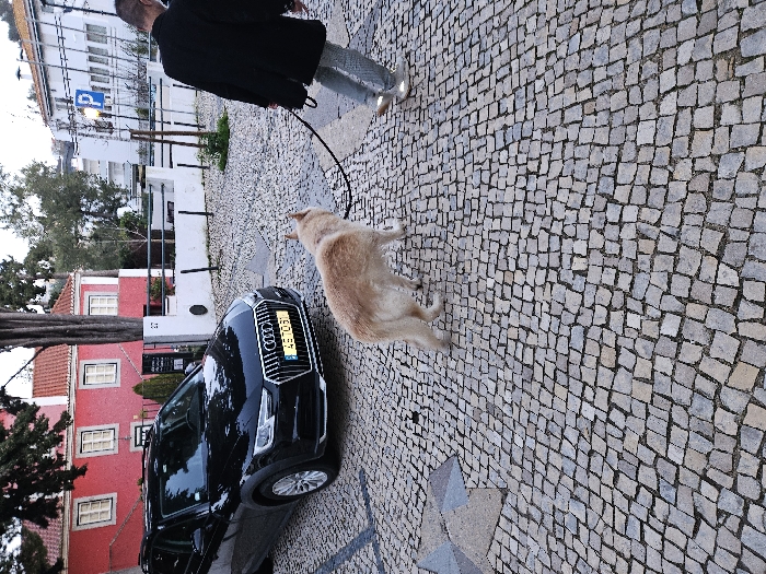 A man in a black coat walks a golden dog on a leash. They are walking on a cobblestone street. A black car is parked nearby, with a license plate that reads "46 70 GI". Red and white buildings are visible in the background.
