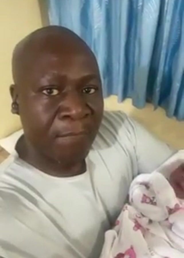 A close-up video shows a dark-skinned, bald man in a light grey shirt, holding a newborn baby wrapped in a white blanket with pink teddy bear patterns