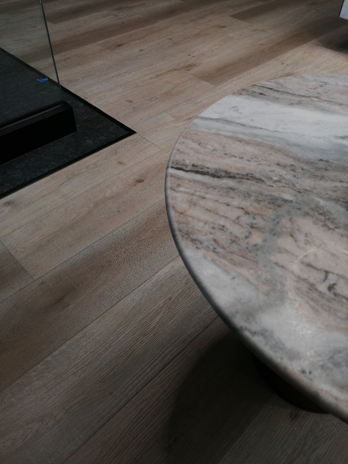 An indoor location in the city of Unknown, Unknown, displays a partial overhead view of a modern interior space. In the foreground and extending into the mid-ground on the right, a segment of a circular tabletop crafted from polished marble is visible, featuring intricate patterns of white, gray, and reddish-brown veins. The table casts a dark shadow beneath its visible edge. The floor throughout the scene is composed of light brown, wood-effect planks laid horizontally. In the upper left quadrant, a section of what appears to be a contemporary fireplace or room partition is visible. This includes a rectangular dark gray or black mat positioned on the floor, bordered by a thin black frame. Rising vertically from a black base on this frame is a clear glass panel, with a small blue adhesive strip visible on its lower left edge. No people or active interactions are present in the scene.