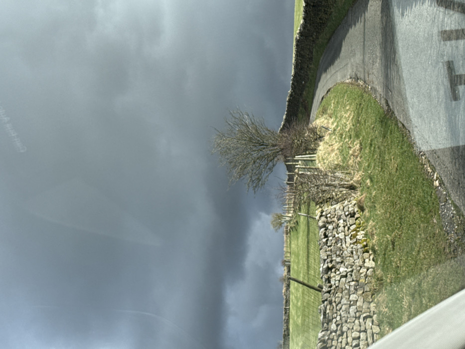 The image depicts a rural road scene under a heavily overcast, dark grey sky, characteristic of the countryside surrounding Lancaster, United Kingdom. The perspective is from within a vehicle, with visible reflections on a windshield, including faint partial text ("Good luck V" in the upper-right quadrant and "TIM" in the lower-right foreground). A narrow, single-lane asphalt road, appearing worn with lighter patches of repair, curves sharply to the right and ascends gradually from the lower-center foreground into the mid-ground. The road is bordered on both sides by dry stone walls. On the left side, a dry stone wall, partially covered with moss and lichen, defines the lower edge of a vibrant green, cultivated field that slopes upward. Further uphill in the mid-ground, a second dry stone wall runs parallel to the first, marking another field boundary. Several wooden fence posts are visible along these boundaries. Sparse, leafless bushes or small trees are situated along the field edges. On the right side of the road, a continuous dry stone wall parallels the road's curvature as it ascends. Between this wall and the road, a strip of unkempt grassy verge contains dry, yellowed grass and small, bare shrubs. A singular, large, leafless deciduous tree with a dense branch structure stands prominently adjacent to the right-hand side of the curving road, silhouetted against the dark sky. A smaller, bare tree is visible further along the road on the same side. The sky is dominated by thick, dark grey storm clouds, though a slightly lighter grey patch is visible in the upper-left quadrant. No human or animal subjects are present, and no specific actions or interactions are occurring. The lower-left foreground shows a partial view of a light-colored internal vehicle component.