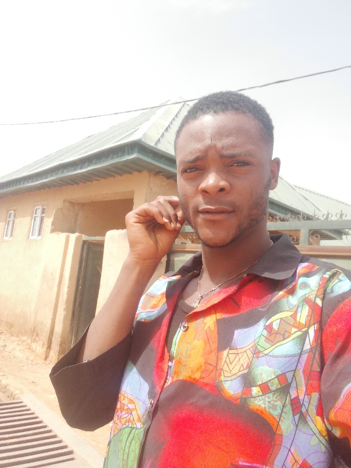 A single adult male is depicted in a full-frontal, head-and-torso outdoor portrait. The male, of apparent African descent, has short dark hair and stubble, and wears a multi-colored, abstract-patterned short-sleeved shirt over a dark undershirt, with a silver-colored chain and pendant visible. His right hand is raised, with fingers touching his cheek near his ear. He maintains a neutral expression, looking directly at the camera. The background consists of a light brown or tan building with a dark green corrugated metal roof on the left, featuring at least two small white-framed windows. A dark metal gate or fence section is partially visible to the right of the male. The ground immediately in front of the male features a metal grate. The sky above is bright and clear, indicating daytime. The scene is located in a residential area within the city of Unknown, Unknown.