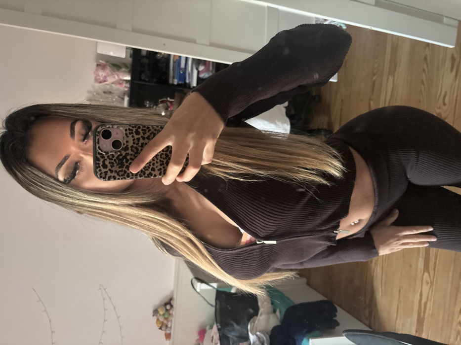 The image portrays a female subject taking a mirror selfie in an indoor setting, identified as being in Erstein, France. The subject, an adult female with long, straight, blonde-brown ombre hair, holds a smartphone with a leopard print case, obscuring her face from the nose upwards. She wears a dark brown ribbed knit cropped zip-up cardigan, partially unzipped to reveal a multi-colored striped bra, and matching dark brown ribbed knit high-waisted leggings. A silver-colored navel piercing is visible. Her left hand holds the phone, while her right hand rests on her hip. The background elements include a white wall with a string of decorative lights on the left. Below these lights, a white bed frame with a blue-green sheet and a black bag are visible, alongside a shelf displaying small, colorful, spherical objects. To the right, a dark shelving unit holds miscellaneous items, including what appears to be a pink floral arrangement. The floor is composed of light-colored wooden planks.