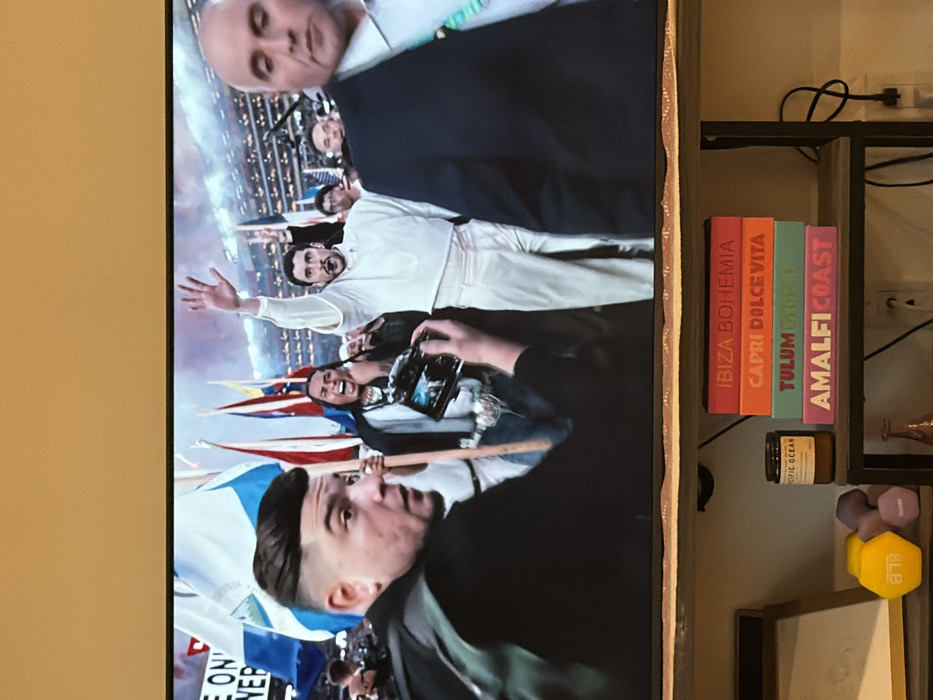 television screen displaying a crowd of people. Some individuals are holding flags and smiling. In the foreground, a man appears to be taking a photo. A bald man in a dark suit is also visible. To the right of the screen is a shelf containing books titled "IBIZA BOHEMIA," "CAPRI DOLCE VITA," "TULUM," and "AMALFI COAST." A candle labeled "PACIFIC OCEAN" and some dumbbells are also on the shelf. A power outlet is on the wall behind the shelf.