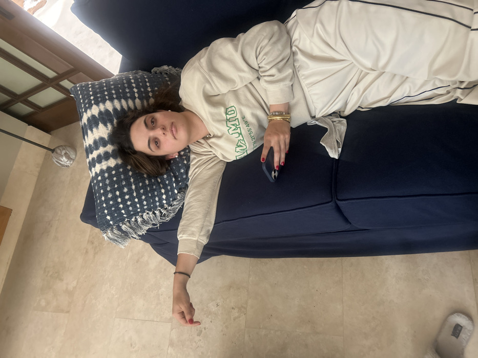 A woman is lounging on a dark blue couch, head resting on a patterned pillow. She wears a cream-colored sweatshirt and matching sweatpants with dark stripes. Her left arm extends towards the floor, while her right hand holds a dark-colored phone. Her nails are painted red. The background features a light-colored tiled floor and a glimpse of a door with a decorative glass panel. A gray slipper is visible in the bottom right corner.