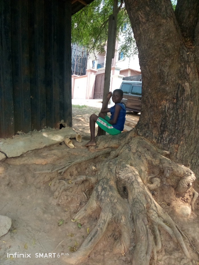 A young child wearing a blue top and green shorts sits at the base of a large tree with exposed roots. Two sandals rest near the child, next to a dark metal structure. In the background is a house with a light-colored fence and a dark van is parked nearby. The ground is dirt, and the scene appears to be outdoors during daylight.