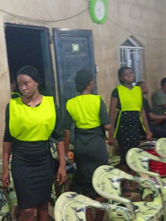 Three young women stand wearing black dresses and bright yellow vests. They are in a room with white walls and a green clock. There is a dark doorway and a small window covered with metal bars. The room is lit by overhead lighting. In the foreground are stacked white chairs with blue-grey patterns. There are several people sitting behind them in the background.