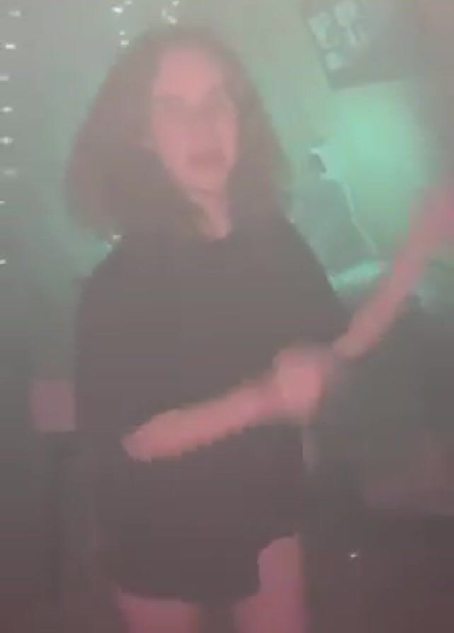A woman with curly brown hair, wearing a black t-shirt, dances in a room filled with a fog-like haze. The room is illuminated by different colored lights, including green, blue, and pink. In the background, there are string lights and a few blurred objects, one possibly a table. The woman is facing the camera and singing along to the music. Her body language is animated as she moves to the beat.