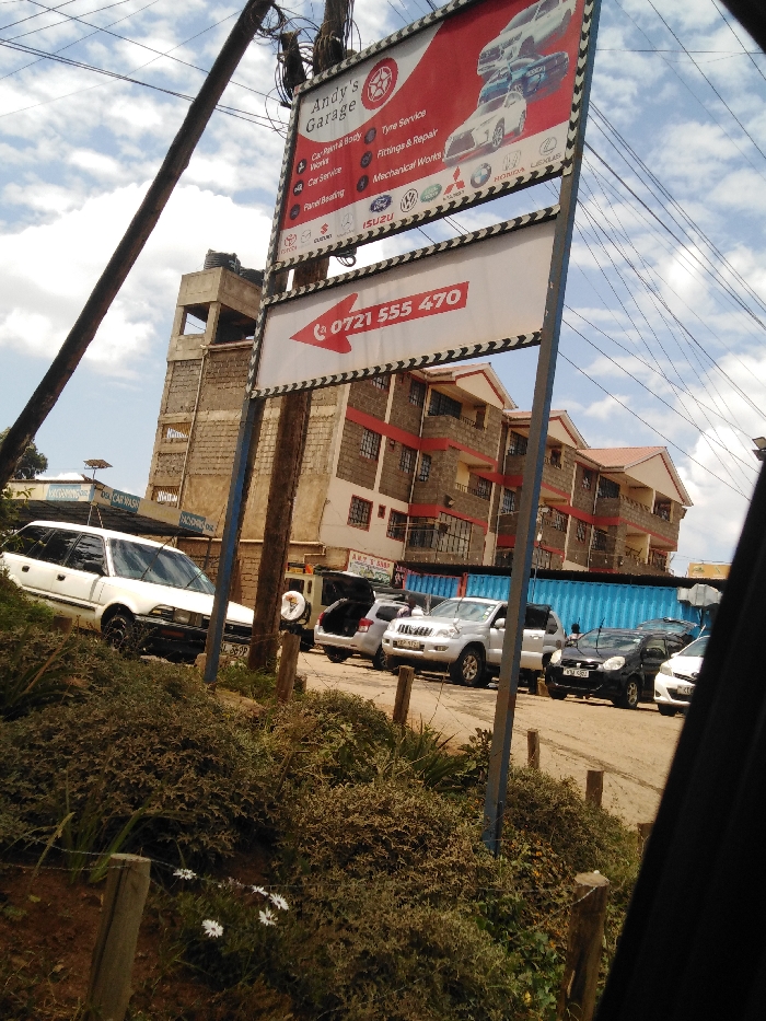 The image displays a commercial street scene in Kikuyu Township ward, Kenya, under a partially cloudy sky. A large, prominent vertical sign for "Andy's Garage" dominates the center, featuring a red and white design listing services such as Car Paint & Body Work, Tyre Service, and Mechanical Works, along with logos of various car manufacturers (e.g., Toyota, VW, Honda, Mercedes). Directly below this, a smaller white sign with a red left-pointing arrow displays the contact number "0721 555 470." To the left, a multi-story building constructed from light-colored concrete blocks, topped with a water tank, is partially visible. To the right and behind the main sign, another multi-story residential or mixed-use building with multiple balconies, red trim, and a reddish-brown tiled roof is situated. Utility poles with numerous overhead wires are visible on the left and framing the central sign. The foreground consists of dense, unkempt green and brown vegetation with a few white daisy-like flowers. Vehicles are parked on an unpaved or dirt surface. A white Toyota Corolla station wagon (partial license plate K... 359P) is visible on the far left. In the mid-ground, a silver Toyota Land Cruiser Prado SUV (partial license plate K... 178X) is parked, its tailgate open. Further back, several other vehicles, including a black car and a white car, are partially obscured. A large, light blue shipping container is visible in the background, likely serving as a workshop or storage unit. One individual is faintly visible near the blue container, and another appears to be near the open tailgate of a silver SUV. The scene indicates an active garage and parking area.
