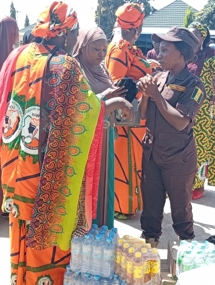 The image captures an outdoor scene in Kabala, Nigeria, likely within the premises of a correctional facility or related institution. In the foreground, a female officer of the Nigerian Corrections Service stands on the right, wearing a brown uniform, cap, and displaying a yellow and green insignia along with "CORRECTIONS" on her left chest pocket. She is facing left, with her hands clasped in front of her, appearing to speak. To her left, a woman in a light brown hijab holds and views a black smartphone. Adjacent to her, a woman faces away, wearing a vibrant orange, black, and green patterned traditional garment, featuring a prominent 'NAWOJ' (Nigerian Association of Women Journalists) logo on her back. Several other women in similar colorful traditional attire and headwraps are visible in the midground and background, observing the interaction. Stacked on the ground in the lower foreground are multiple plastic multi-packs of bottled water with blue caps and multi-packs of bottled yellow beverages with yellow caps. The background includes a light-colored building, green trees, and a clear blue sky, indicating bright daylight.