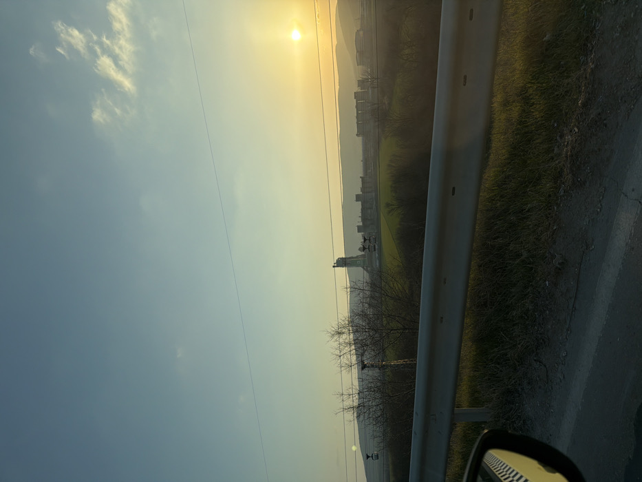This image depicts a wide shot of an industrial and rural landscape at sunset, viewed from a vehicle on a road near Kipra, Bulgaria