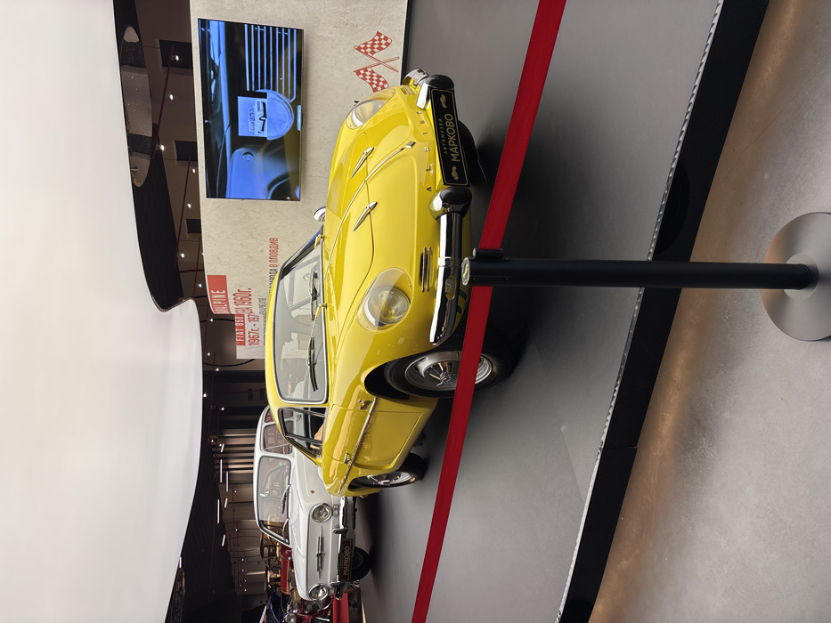The image depicts an interior scene within a car museum located in Markovo, Bulgaria. The central focus is a bright yellow, two-door vintage Alpine sports car, prominently displayed on a dark grey elevated platform. This vehicle features chrome front bumpers, circular headlights with clear covers, and a license plate reading "АВТОМУЗЕЙ МАРКОВО" (Automuseum Markovo). In the immediate foreground, a red velvet rope barrier, supported by black stanchions, separates the viewer from the display. Behind the yellow Alpine, positioned slightly to its left, is a white two-door vintage Fiat 850 coupe, also situated on a similar dark grey platform. Its front license plate displays "МАРКОВО". The background features a large digital screen to the right, exhibiting a close-up image of a car's interior or emblem. Adjacent to the screen and behind the vehicles, a display wall presents text in Cyrillic, referencing "ALPINE" and "FIAT 850 BHA 1960г." (Fiat 850 BHA 1960s), along with "1967-1971 ГОДИНА В ПЛОВДИВ" (1967-1971 year in Plovdiv). Two checkered racing flags, one red and white, the other black and white, are affixed to this wall. The ceiling above is a large, irregularly shaped, smooth white surface, contrasting with darker architectural elements. The exhibition space is brightly and uniformly lit. No people are present, and no actions or interactions are depicted within the frame.