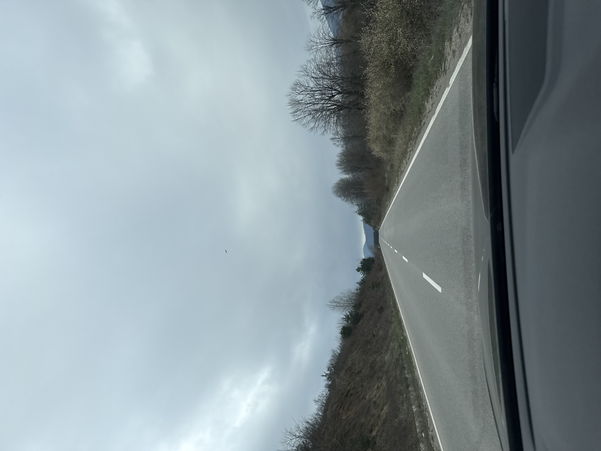 gray asphalt road stretching into the distance under an overcast sky. The road is marked with white lines. The view is from within a vehicle, with part of the vehicle's interior visible on the right. The roadside consists of dry, brown vegetation and bare trees. There is a hint of mountains or hills in the distance. The photograph was taken in Mezdreya, Bulgaria.