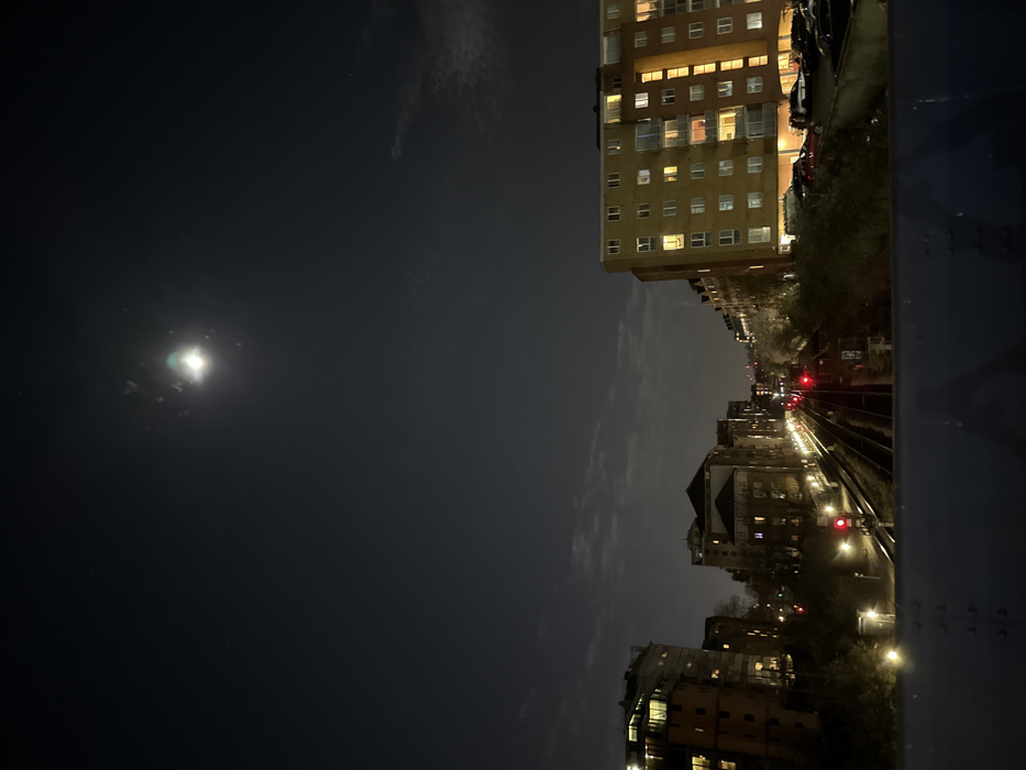 The image displays a night-time urban landscape in London, United Kingdom, viewed from an elevated position, likely a bridge. The upper third of the frame shows a dark sky with scattered, low-lying clouds and a bright, full moon centered in the upper middle, exhibiting a distinct lens flare. Below the horizon, two parallel railway tracks extend into the distant perspective, bordered by sporadic low-level vegetation and equipped with multiple red signal lights, indicating an active line, alongside trackside illumination. Multi-story residential and commercial buildings, many with illuminated windows, flank both sides of the railway tracks. On the immediate right, a large, multi-toned building, primarily beige and brown, features numerous windows and balconies, beneath which a ground-level parking area contains several parked vehicles. The immediate foreground shows the top edge of a blue-painted metal structure with visible rivets. No individuals or specific actions are discernible.