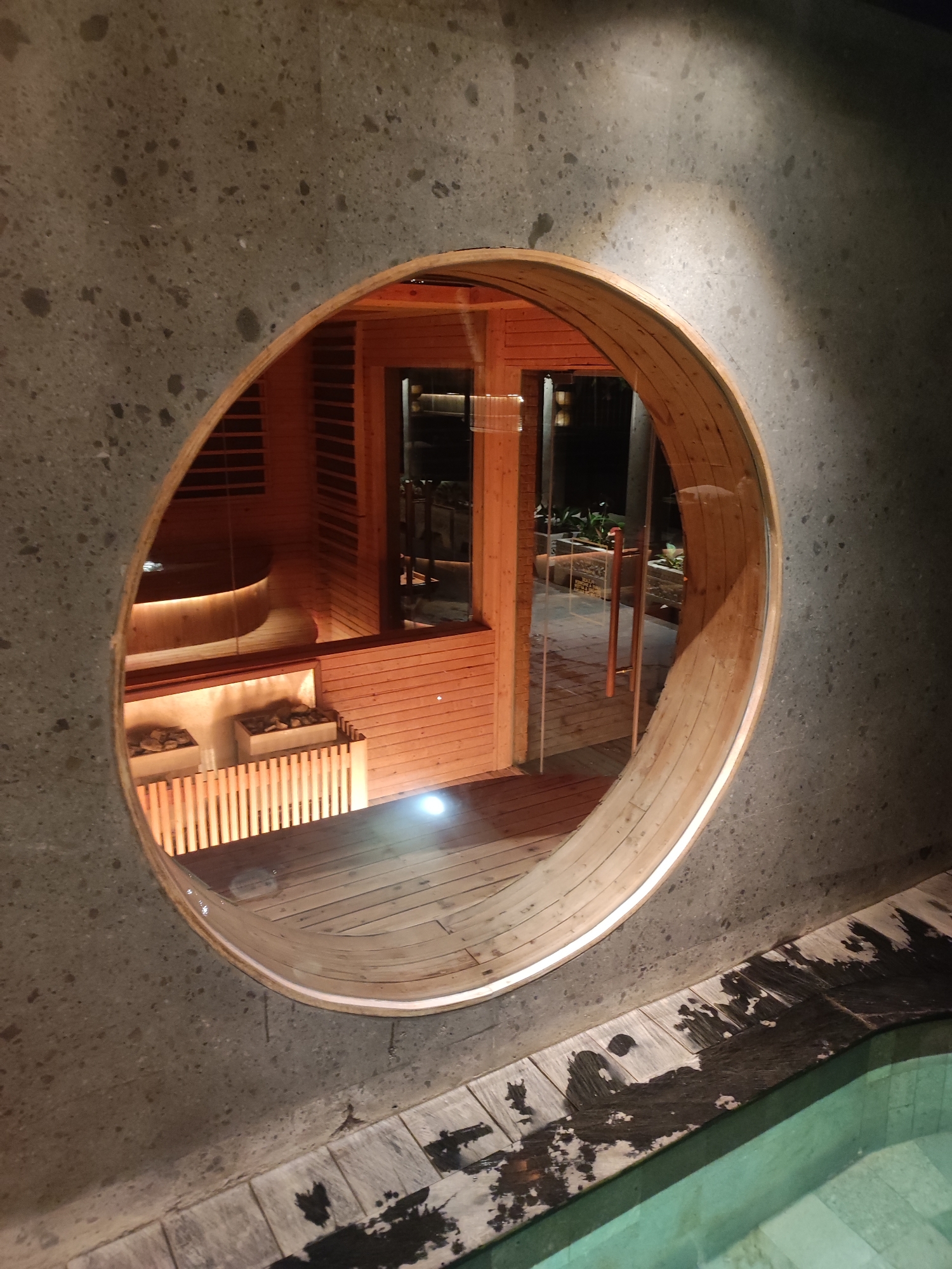 This image captures a nighttime view through an oval-shaped opening in a dark gray, speckled concrete wall, revealing a warm-toned wooden interior space and an exterior area beyond it, located in Mas, Indonesia. **Scene Elements:** - **Foreground (bottom right):** A light greenish-blue swimming pool is partially visible, bordered by a dark-stained wooden deck showing wet patches. - **Concrete Wall:** The dark gray concrete wall, speckled with lighter aggregate, dominates the foreground and frames the central oval opening. - **Oval Opening:** The opening is framed by a smooth, light-colored wooden archway. - **Wooden Interior (visible through opening):** Inside, the walls and floor are constructed from warm-toned wooden panels and floorboards. - **Left Side:** A circular wooden tub or basin with an illuminated base is situated on an elevated wooden platform. - **Center:** Below the tub, two square-shaped containers filled with rocks, illuminated from within, are visible behind a vertical wooden slat barrier. - **Back:** A clear glass door with two vertical bronze-colored handles leads from this wooden room to an exterior space. - **Exterior Area (beyond glass door):** A dimly lit outdoor patio or garden area features dark paving and planters containing green foliage. - **Lighting:** The interior wooden space is brightly illuminated by warm, artificial lights, casting a glow. The concrete wall is subtly lit, with a brighter patch in the upper right. **Absence of:** - No individuals are present in the scene. - No direct actions or interactions are depicted.