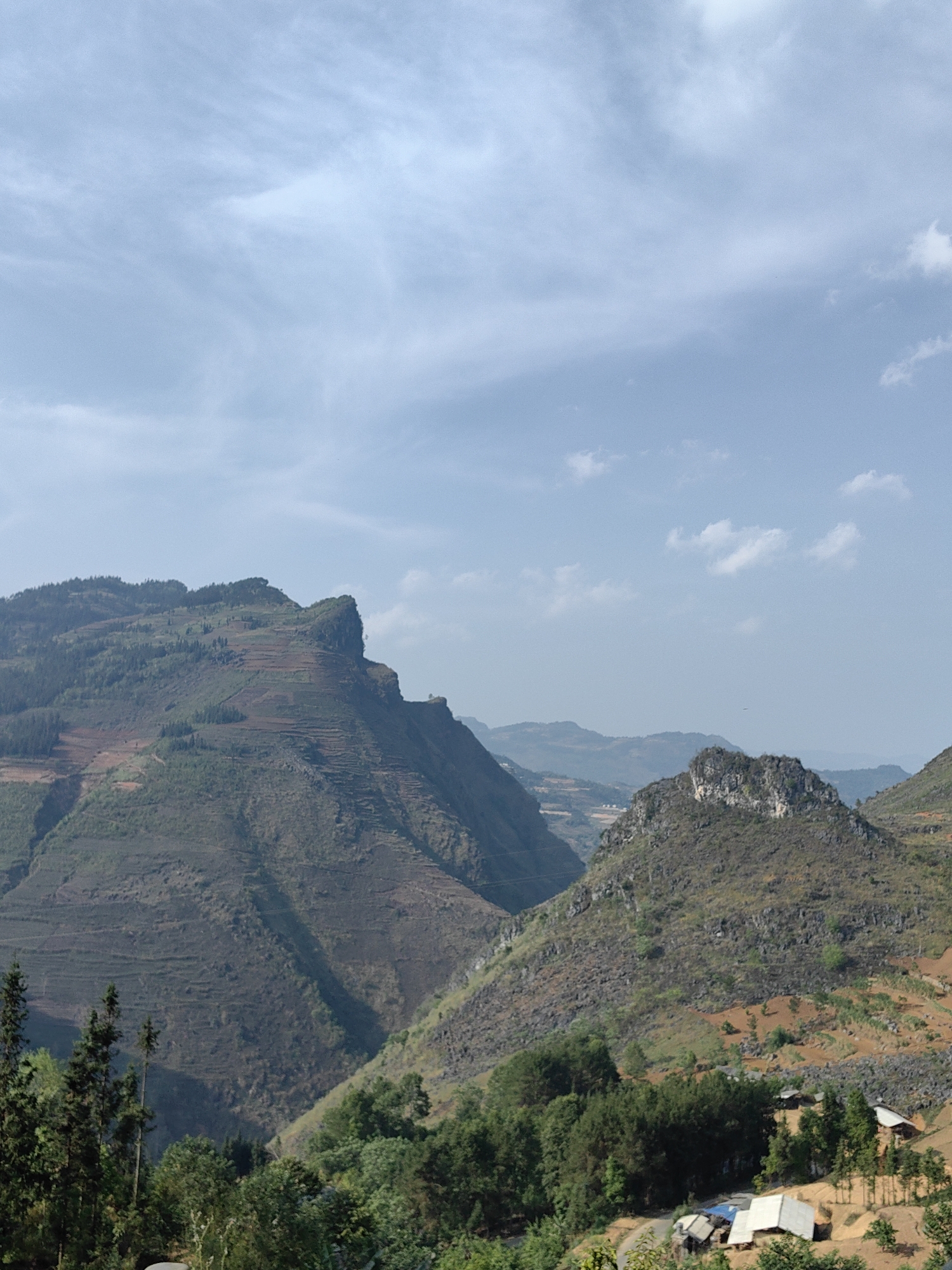 The image captures a mountainous landscape in the Đồng Văn Commune, Vietnam. A large, terraced mountain dominates the left side of the frame, its slopes displaying a mix of vegetation and bare earth. To the right, a smaller, rocky peak stands, partially covered in trees and interspersed with reddish soil. In the foreground, a cluster of trees and shrubs frames the lower part of the scene. Scattered among these trees are several small buildings with corrugated roofs, suggesting a rural settlement. The sky above is a light blue, with thin, scattered clouds. The overall impression is one of a rugged, mountainous terrain interspersed with human settlements.