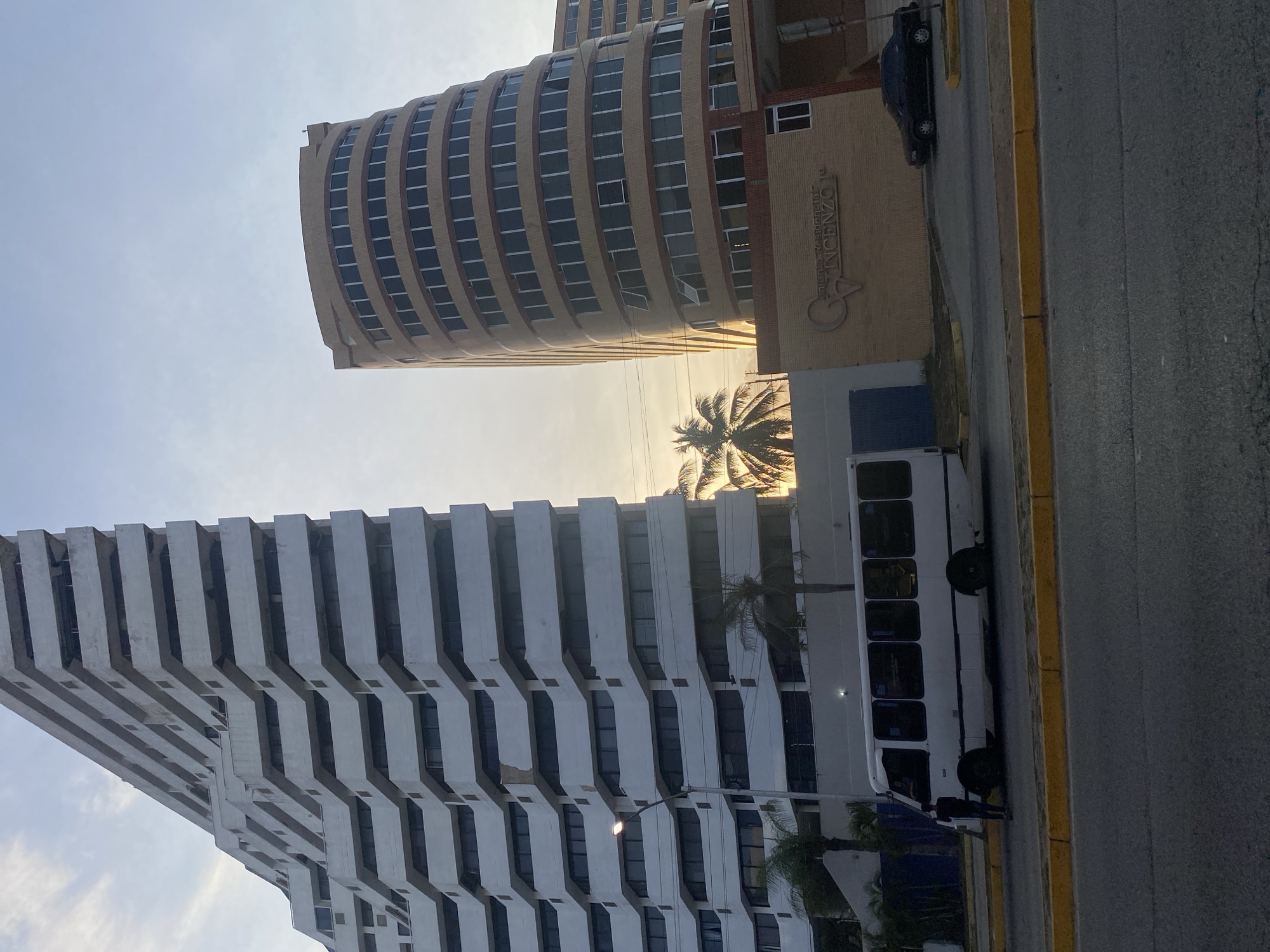 Here is a concise description of the image: The image shows two buildings in Porlamar, Venezuela, a curved beige building with numerous windows and a sign that says "Conjunto Residencial INCENZO" and a white building with horizontal protruding structures