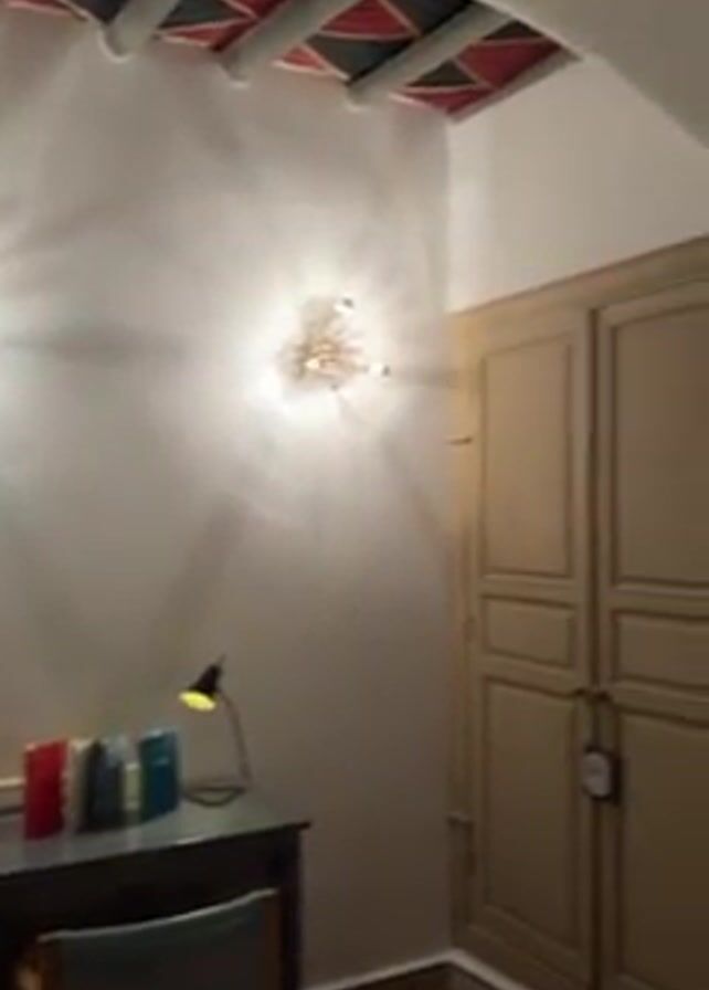 slow pan of a hotel room interior. It begins with a view of a small desk with books and a lamp, flanked by two light fixtures on the wall. The camera then moves to the right, revealing a double door closet. The pan continues to show a bed with white linens and a rug on the wall. An air conditioning unit is mounted high on the wall above the bed. The ceiling has a dark wooden beam structure with colored inlays between the beams. The video ends with a partial view of an adjoining room with a chair, fireplace, and black and white art on the wall.