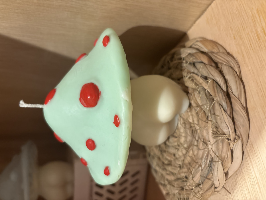 A mushroom-shaped candle rests on a shelf next to a woven basket