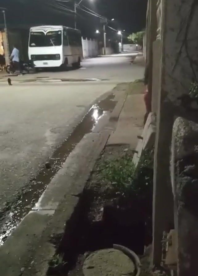 street scene at night. Streetlights illuminate a road with puddles and a sidewalk with grass. In the background, a white van and a red pickup truck are parked. People are milling around near the red truck, with one person walking towards the van. The camera focuses on the sidewalk and then pans towards the street.