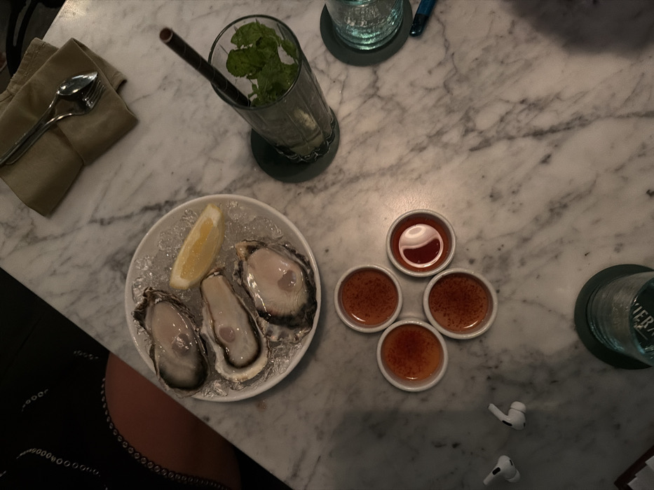 The image displays an overhead view of a white marble table in a dimly lit establishment located in Tibubeneng, Indonesia. A white circular plate containing three raw oysters on a bed of crushed ice, garnished with a single lemon wedge, is positioned in the upper-left quadrant. Below this, four small white circular dishes are arranged in a cluster, each containing a reddish-brown liquid. To the upper-right, a beige folded cloth napkin secures a silver fork and spoon. A tall, clear, fluted glass containing a beverage with mint leaves and a dark straw rests on a dark green coaster on the right side of the table. Another clear glass, partially obscured and on a dark green coaster, is visible in the bottom-left corner, showing part of a label. Two white wireless earbuds are placed on the table to the left of the sauce dishes. A blue pen or similar writing instrument is partially visible on the table surface near the right side. A person wearing a dark, patterned garment is partially visible along the top-left edge of the frame.
