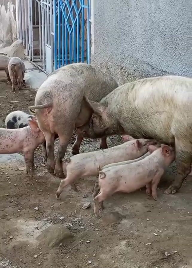 - "group of pigs, including two adult sows and several piglets, in a dirt area next to a building" by FM-hTtyx1, licensed under CC BY 4.0