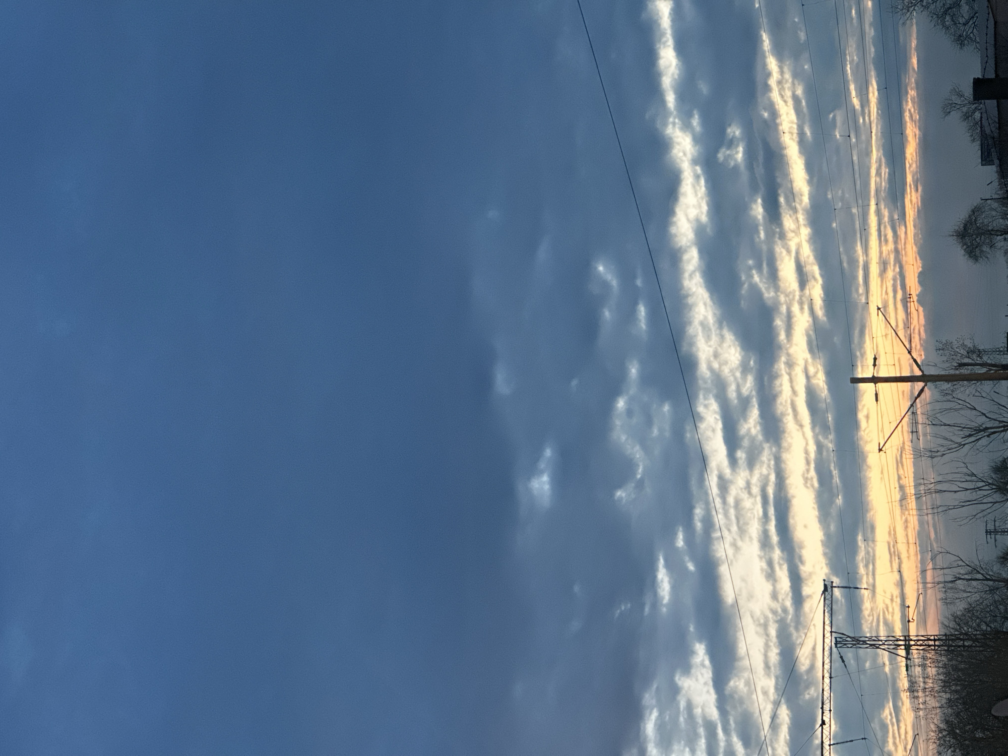 sky with cloud formations running in horizontal lines in Graf Ignatievo, Bulgaria. A set of power lines and utility poles run parallel to the cloud formations. Bare trees are visible on the right, silhouetted against a pale orange or yellow sky indicating sunrise or sunset. A portion of the sky is a clear blue on the left.