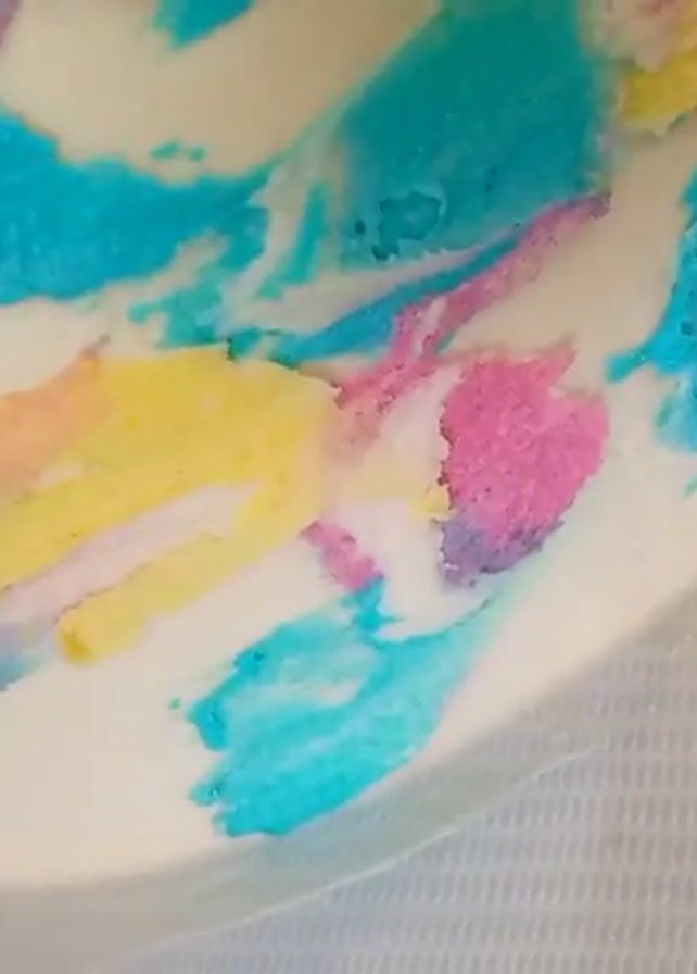 close-up of a cake decorated with white frosting and brightly colored swirls of pink, yellow, and blue