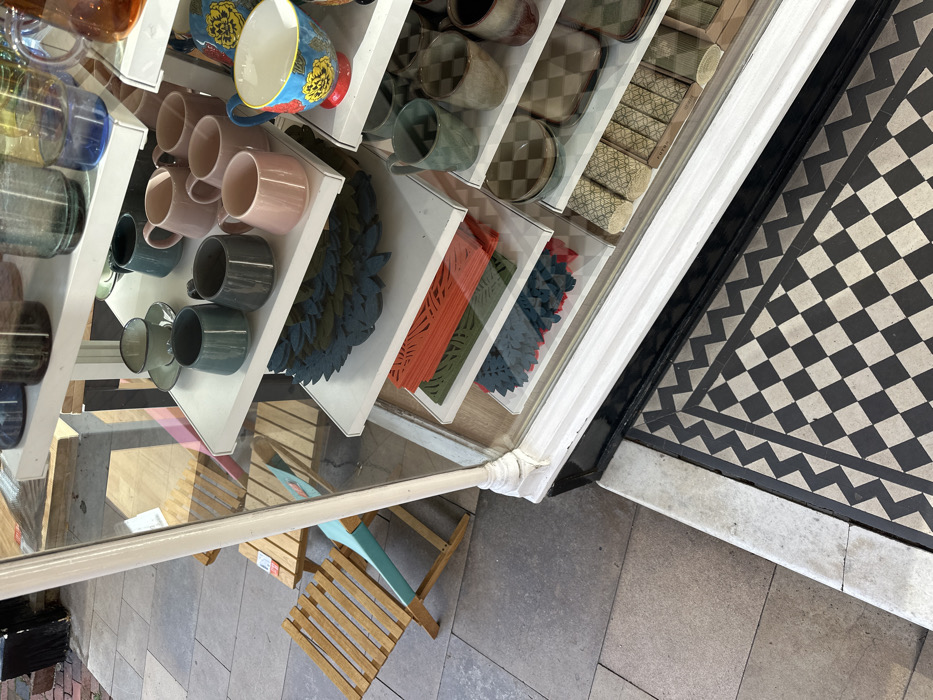 This image captures a partial view of a shop window display and the adjacent exterior pavement in Tunbridge Wells, United Kingdom
