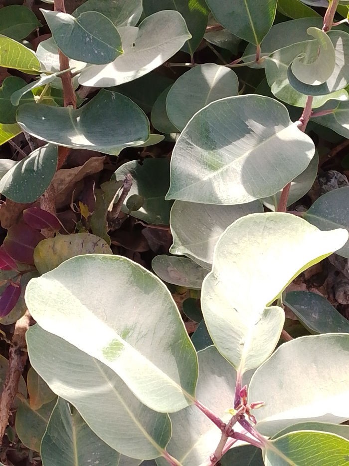The scene depicts a close-up, downward-angled view of dense plant foliage in Bahit, Nigeria. Numerous ovate to rounded leaves with smooth margins are visible, displaying various shades of green, from pale silvery-green where illuminated by direct sunlight to darker olive-green in shadowed areas. Reddish-brown stems and petioles connect the leaves. Direct sunlight creates bright highlights on the upper surfaces of many leaves and casts discernible shadows. Beneath the primary foliage, patches of dried brown leaves and some smaller, darker reddish-purple leaves are visible as ground cover. No individuals or man-made objects are present.