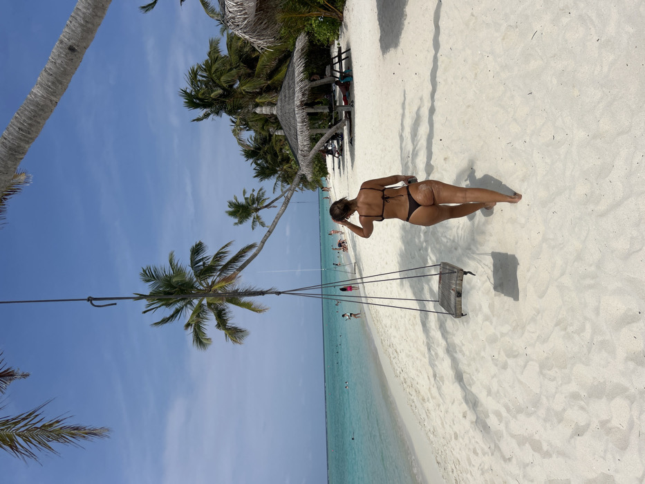 A tropical beach scene features a woman in a bikini standing on white sand near a swing hanging from a palm tree
