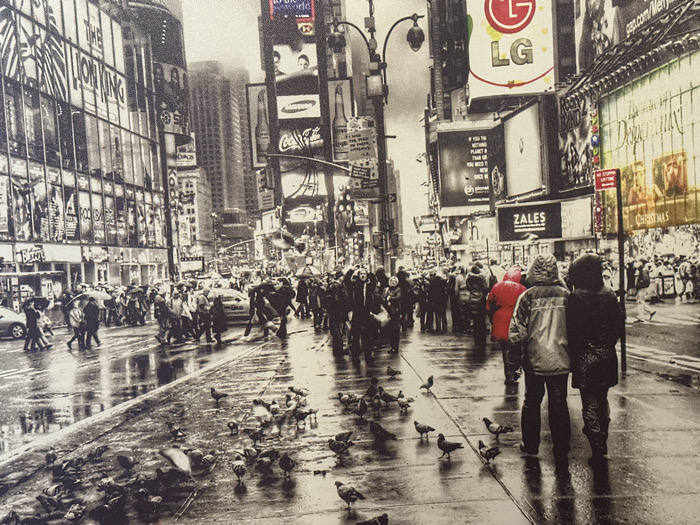A monochrome urban street scene depicts a rainy day in a bustling city. People with umbrellas and raincoats navigate across streets filled with puddles and reflections. Numerous pigeons are scattered across the wet pavement. Tall buildings with illuminated billboards and advertisements frame the background. A large LG sign is prominent on one building. The overall atmosphere is dark and crowded, conveying a sense of urban activity and weather conditions.