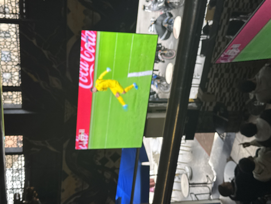 A bar or restaurant setting shows a large screen displaying a soccer match