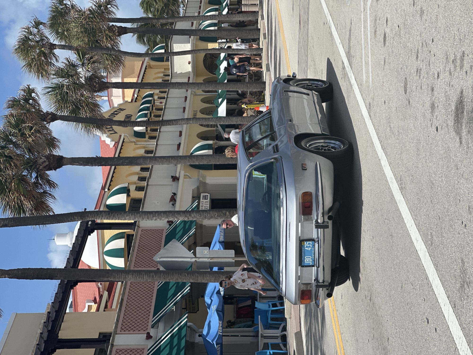Here is a forensic description of the image: The image shows a gray car parked on the side of a street lined with palm trees and buildings with striped awnings. The car has a Florida license plate that reads "JBO 435" and the word "ANTIQUE." People can be seen walking and sitting outside the buildings. There are blue umbrellas outside of the shops. The buildings have signs reading "TH BEACH" and "LAKE WORTH B" and "INO" and "NWALK". The photo appears to be taken in Lake Worth Beach, United States of America.