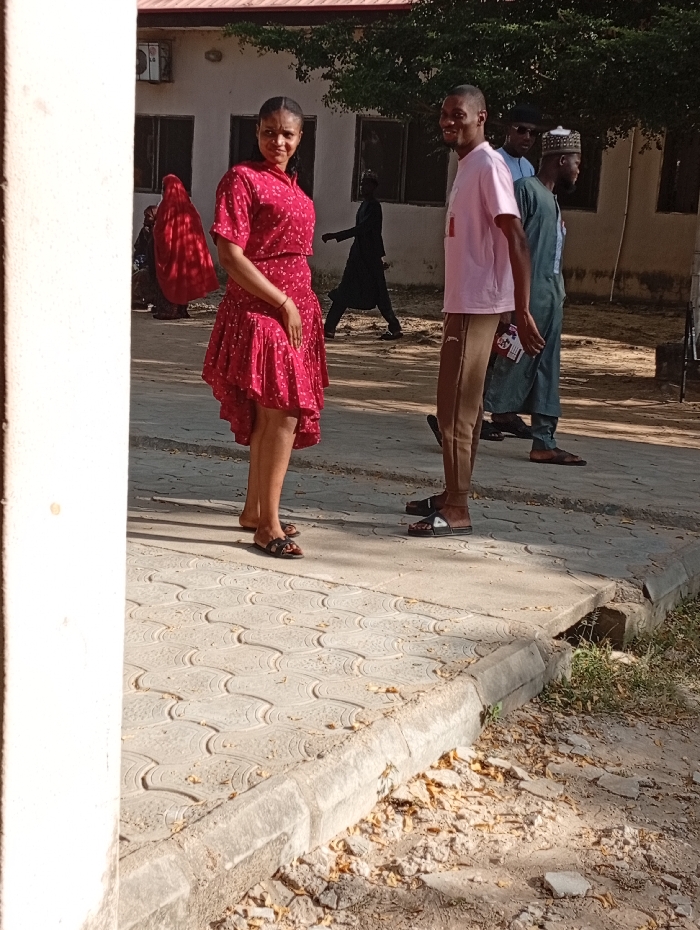 This image captures an outdoor daylight scene in Dabawa, Nigeria, featuring multiple individuals on a patterned concrete sidewalk adjacent to a dirt patch and a building