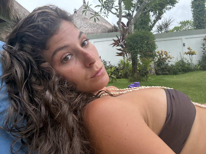 An image captured in Pecatu, Indonesia, displays a female subject lying on her back, her head supported by a blue cushioned surface