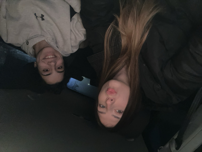 The image captures two female individuals inside a vehicle during nighttime hours. The specific location within the city of Haskovo, Bulgaria, cannot be determined from the visual information presented. The individual positioned in the foreground on the left has long, straight, brown hair with lighter ends and is wearing a dark, likely black, puffer jacket. This individual is making a "kiss" face with pursed lips, looking directly at the camera. The second individual, positioned to the right and slightly behind the first, has dark hair, potentially pulled back. She is wearing a light grey hooded sweatshirt with a dark Under Armour logo visible on the chest. This individual is smiling broadly, with teeth visible, and is also looking towards the camera. The environment is dimly lit, consistent with a vehicle interior at night, with faint, blurred lights visible through what appear to be windows in the background. Vehicle interior components, such as a headliner and a partial seatbelt, are minimally discernible in the darkness.