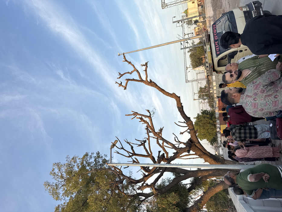 The image depicts an outdoor scene in Ratangarh, India, characterized by a gathering of approximately 15-20 individuals