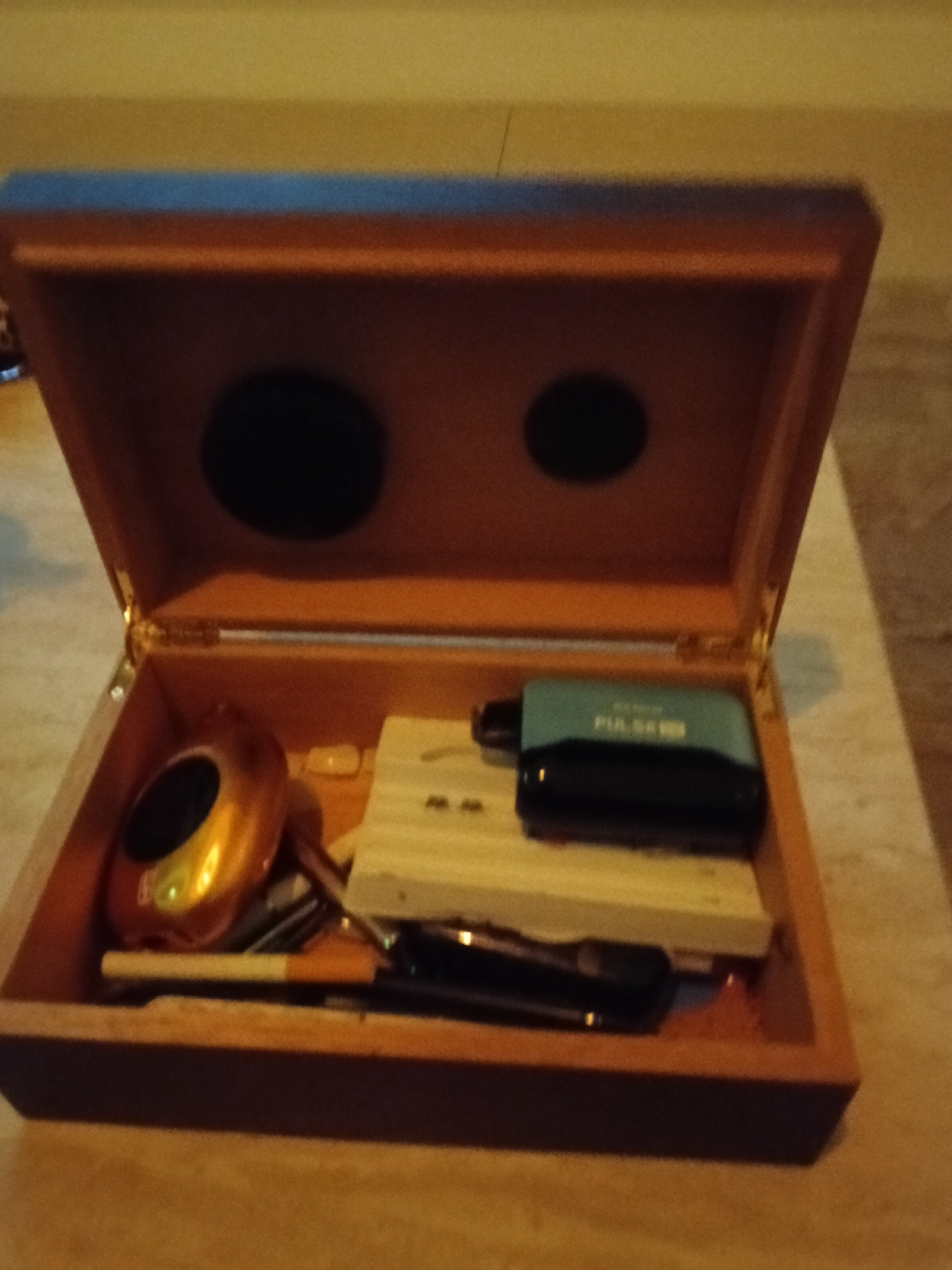 A partially open wooden box rests on a tan surface. The box contains a golden ashtray, a cigarette, a black pipe, and a blue and black vaporizer device labeled "PULSAR." The box lid has two dark, circular depressions. The image provides no information about location, people, actions, or interactions.