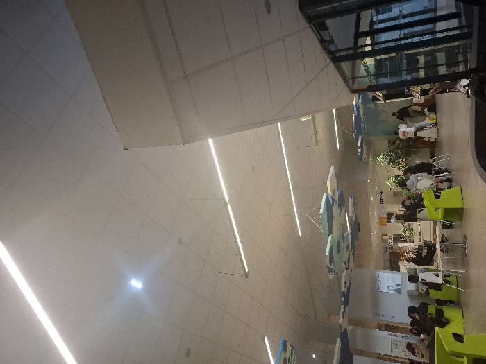 A brightly lit, modern indoor space features a high, white ceiling with parallel fluorescent lights. Below, several people are seated at tables with green chairs, appearing to be reading or studying. Decorative blue and white abstract shapes hang from the ceiling. A bookstore is visible in the background with people shopping. The scene is slightly rotated, presenting a tilted perspective.