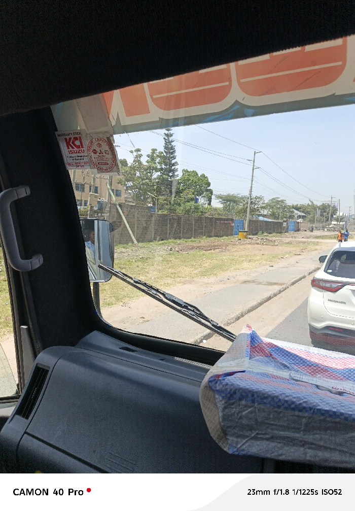view from inside a vehicle, looking out through the windshield. A white car is visible on the road ahead. A grey wall runs alongside the road, and greenery is visible beyond it. A "WARRANTY STICK ISUZU" sticker is affixed to the windshield. A package wrapped in blue and white plastic sits on the dashboard. The camera information "CAMON 40 Pro 23mm f/1.8 1/1225s ISO52" is displayed at the bottom.
