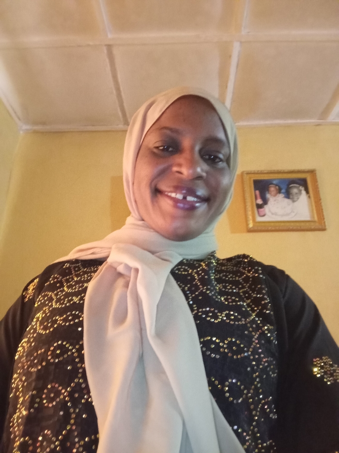 An indoor scene in Narayi, Nigeria, depicts an adult female smiling directly at the camera. She has dark skin, a visible diastema between her upper central incisors, and wears a light beige hijab covering her head and neck, draped over her left shoulder. Her attire includes a black garment embellished with gold-colored beaded or sequined patterns on the chest and sleeves. The background features a light yellow wall and a light-colored paneled ceiling. To the subject's right, a gold-framed photograph hangs on the wall, showing two individuals, one holding a bottle with a red label.
