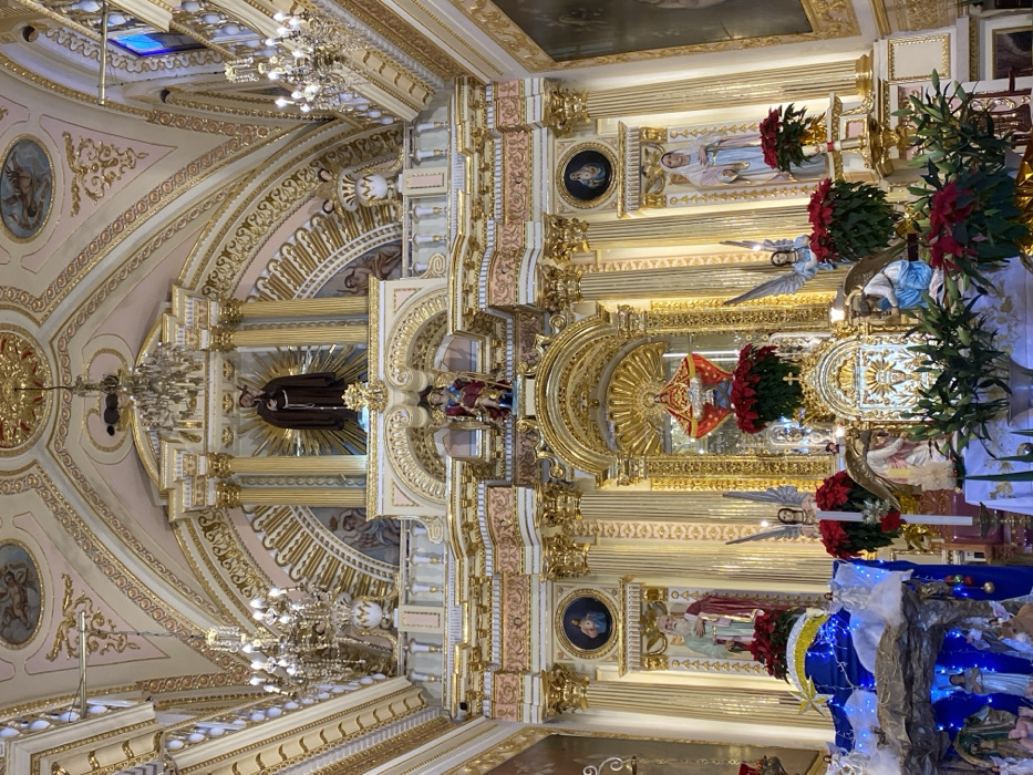 Intricate, ornate details adorn a church interior. Golden embellishments frame statues and religious images on the walls, arranged in tiers. Chandeliers hang from the high, decorated ceiling. Poinsettias and greenery brighten the space, while a nativity scene sits near the bottom, bathed in blue light. The overall impression is one of reverence and grandeur.