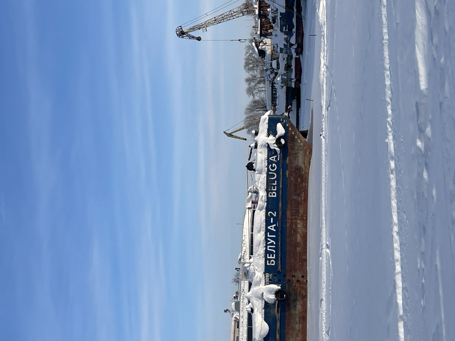 The image depicts a winter scene at what appears to be the Perm River Port on the Kama River in Perm, Russia. A large, blue-hulled cargo vessel, identified by the Cyrillic and Latin script "БЕЛУГА-2 BELUGA" on its side, occupies the left and central foreground. The vessel's hull shows rust-brown discoloration below its blue upper section, and its deck and upper structures are heavily covered in thick white snow. The entire foreground consists of a flat expanse of deep white snow, obscuring any visible water. Faint, parallel tracks are discernible in the snow in the immediate foreground. In the mid-ground and background, multiple other vessels of various sizes, similarly blanketed in snow, are moored or dry-docked. Several industrial cranes, including a prominent lattice-boom crane on the far right, are visible among the vessels and against the horizon. Bare trees line the distant shoreline. The sky above is clear and bright blue, with minimal, wispy white clouds. No people or active operations are visible in the scene.