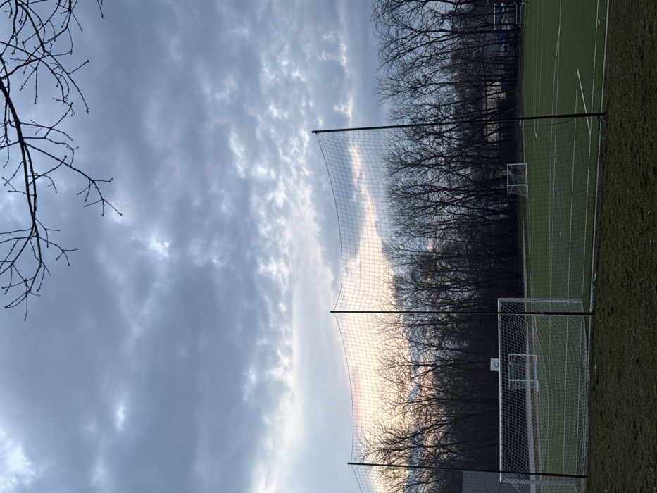 The image depicts an outdoor artificial turf sports field within Botevgrad, Bulgaria. The upper portion of the frame features an overcast sky dominated by gray clouds, with lighter segments on the left horizon displaying subtle pink and orange atmospheric hues. Bare, dark deciduous tree branches extend into the upper right corner of the frame. A tall, dark-colored protective netting system, supported by several black poles, stretches horizontally across the mid-ground, separating the foreground from the main playing area. Behind this netting, a dense line of leafless deciduous trees forms a dark, silhouetted backdrop. The lower half of the image showcases a vibrant green artificial turf pitch. In the left foreground of the turf, a full-size soccer goal with white posts and netting is visible. Directly behind this, a white basketball backboard and hoop are partially discernible. Further to the right on the turf, two smaller soccer goals are present in the mid-distance. The immediate foreground consists of a strip of natural, darker green grass. No individuals are present in the scene.