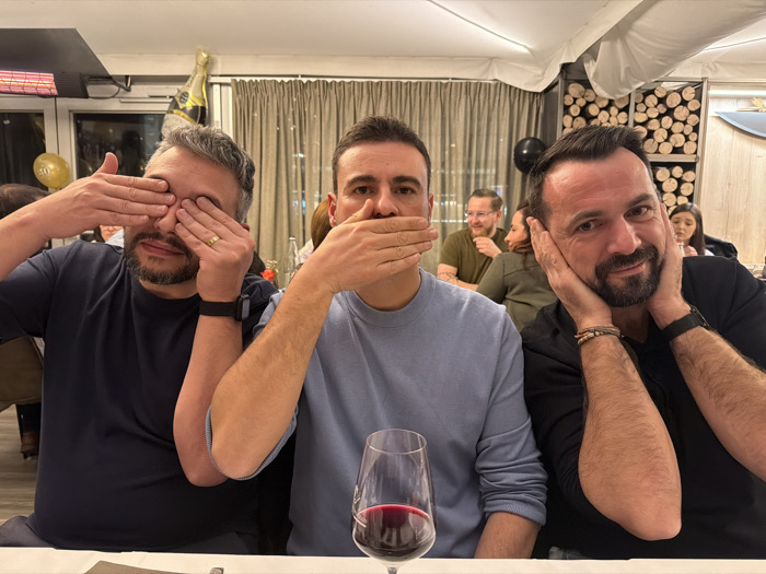 Three men pose in a "see no evil, speak no evil, hear no evil" manner. The man on the left covers his eyes. The man in the center covers his mouth. The man on the right covers his ears. All three are seated at a table with a partially filled wine glass in the foreground. Other diners are visible in the background. A balloon and stacked firewood are visible behind them.